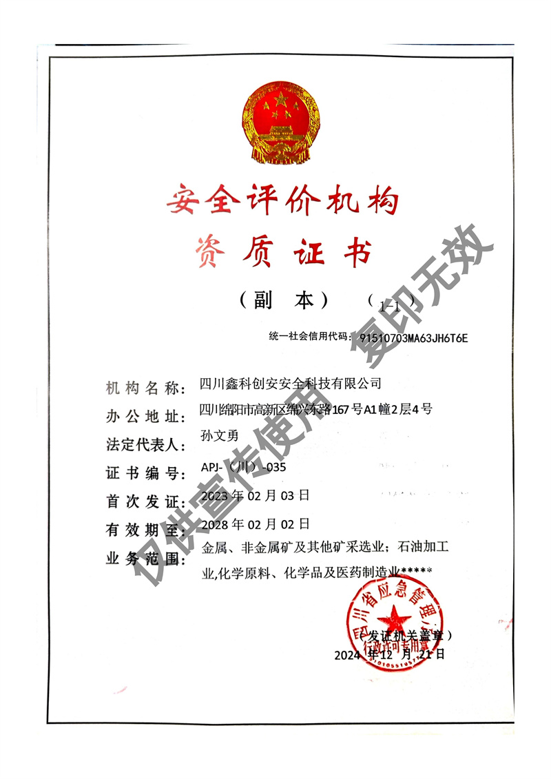 四川鑫科創(chuàng)安安全科技有限公司成立于2020年,是川北地區(qū)取得資質(zhì)的民營(yíng)安全評(píng)價(jià)機(jī)構(gòu)(資質(zhì)證書編號(hào):APJ-(川)-035)。并于2022年?duì)款^成立綜合應(yīng)急救援隊(duì)伍 - 綿陽(yáng)曙光應(yīng)急救援中心。